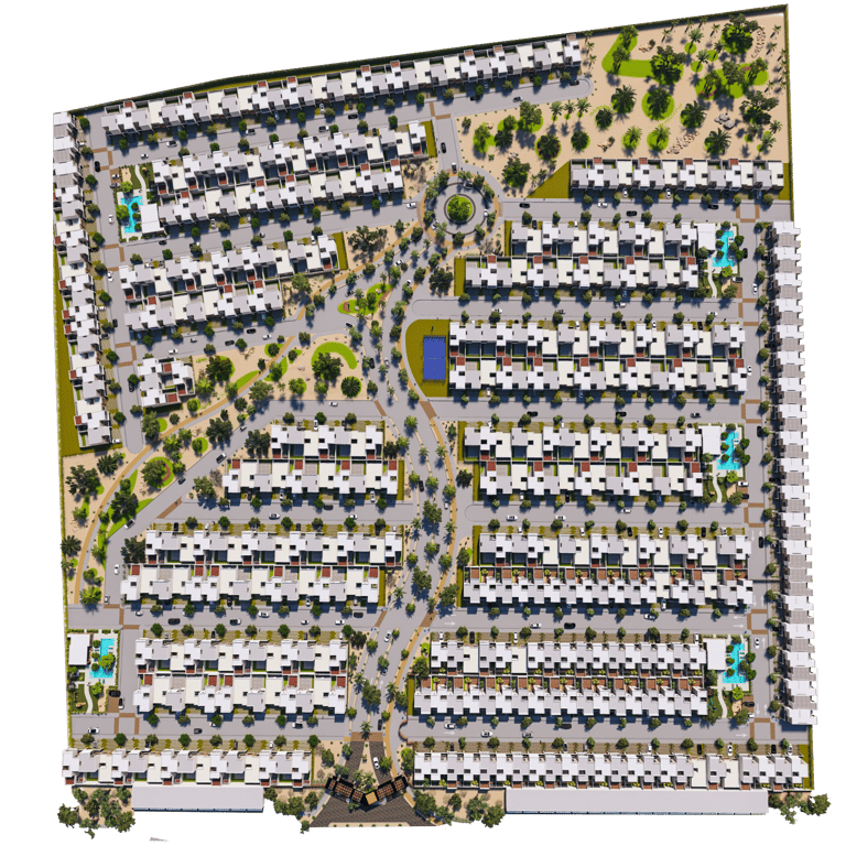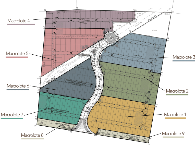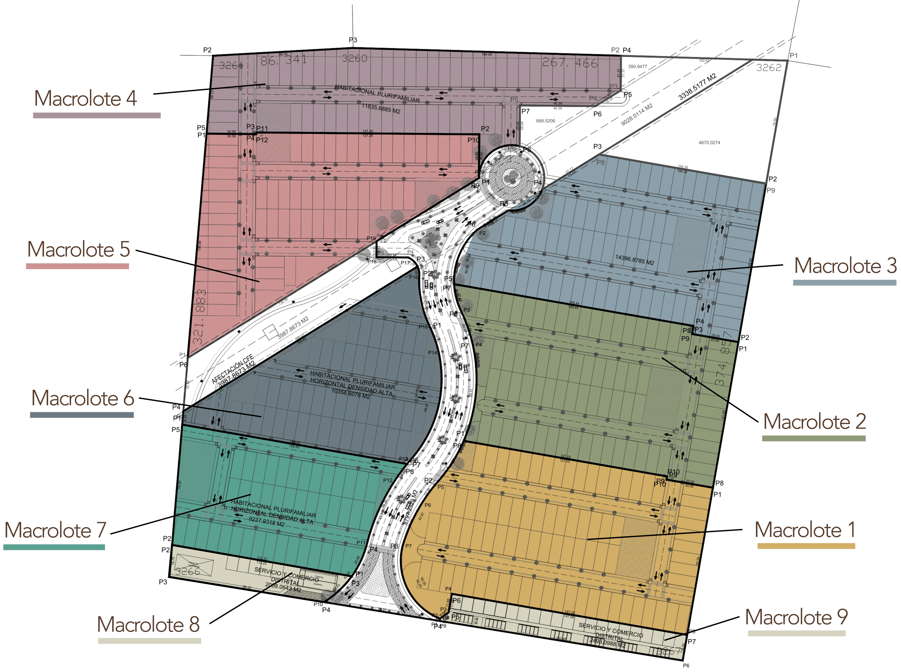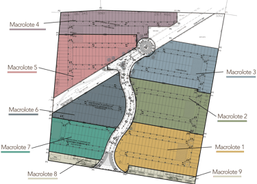 Distrito Terra contará con 8 Macrolotes divididos por dos grandes y principales avenidas arboladas, calles amplias, banquetas corridas, ya que el peatón es el protagonista, una majestuosa glorieta que enmarca la arquitectura urbana del proyecto.